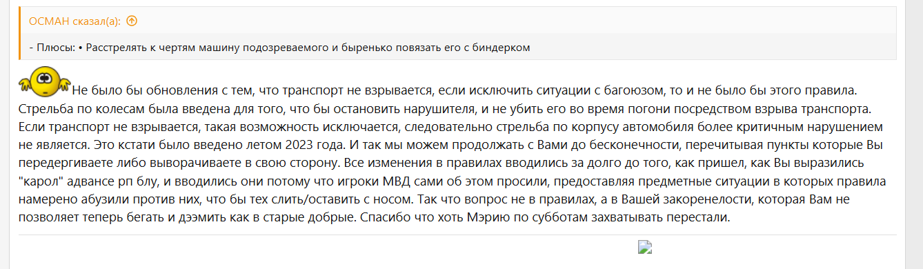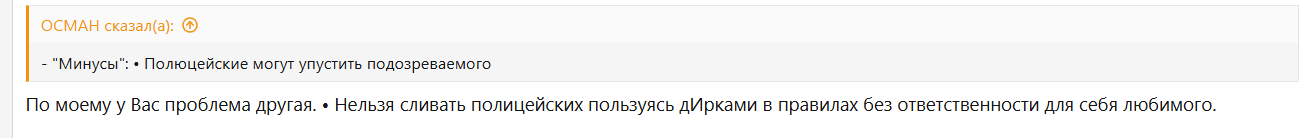 м, неужели. И какими дырами до введения гЕнИаЛьНеЙшЕгО правила ни при каких обстоятельствах не стрелять в полицейских я пользовался? Я в них начал стрелять спустя 2-3 дня как зарегался на этом чюююдном сервере, и у меня нет никаких проблем если меня условно заварнят или отправят в кпз на полвека если я действительно дмил. Я не против если копы будут делать то же самое. Другое дело когда и нападают на меня и варнят тоже меня, это не совсем логично и не очень честно.
