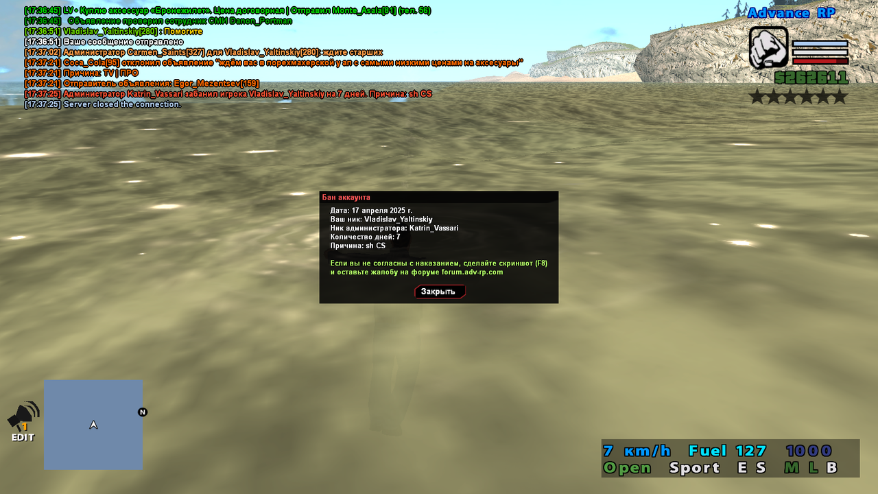 3. Дала 7 дней бана из за SpeedHack.Короче ситуация.Ехал я в Angel Payne выполнять очередное ежедевное задание.Лечу на sport на Sentinel и падаю в воду,типо из за пинга sport люто действует и он меня откинул в воду.Пишу в /mn-6 "Помогите".Администратор Carmen Saints мне ответил "ждите старших".Жду жду давлю на газ и машина чуть чуть поднялась из воды и звук газа сработал,так уже сразу через 3 секунды прилетает бан по причине: sh CS.Хотя у меня на компьютере нету и не было SpeedHack