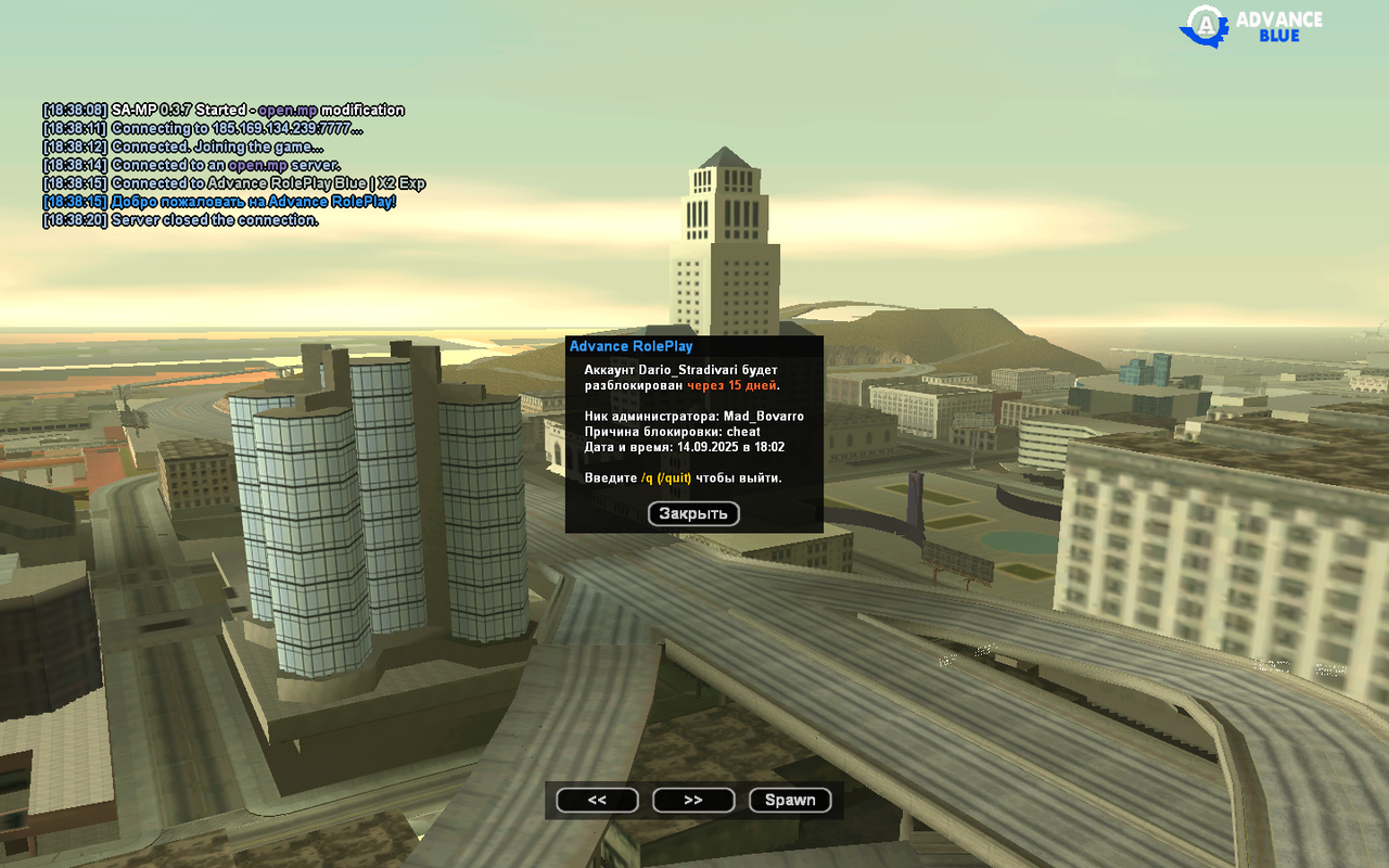 3. Суть жалобы: Зашёл на игру в кальмара поиграть, первая игра была "Третий лишний". На втором раунде в комнатах должно быть по три человека. Я вбежал в комнату, но там никого не было, и чтобы не проиграть я выбежал из комнаты и побежал в другую. Во время этой перетяжки из одной комнаты в другую я слышу звуки стрельбы с Desert Eagle. После того как я вбежал в комнату, через пару секунд у меня в чате высветилось сообщение "Server closed connection", и в ту же секунду мне говорят друзья, с которыми я сидел в Discord что меня забанил Mad Bovarro на 15 дней с причиной чит. Прикол в том, что я за всё время игры на Advance RP никогда не использовал читы. Более того, я являюсь 9-кой LCN, и вот так подставлять лидера я ни за что бы не стал. Засим попрошу разбанить мой аккаунт.