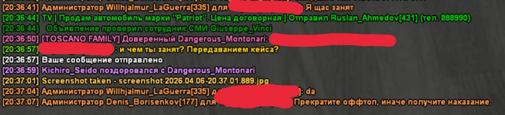 3) Суть жалобы - администратор достал кейс из воды вытащил его на сушу, по сути вмешался куда не должен был, кейс был у берега, зачем и почему он его достал я хз, тут же в моменте подбирают фама browns. Своим действием помог нашей противоположной фаме быстро подобрать кейс из воды чтобы они уехали. Давайте разбираться ибо это уже перебор, я понимаю то что вы тут - https://forum.adv-rp.com/threads/blue-zhaloba-mia_granados.2694509/ закрыли глаза на то что тут другой админ делает грязь, спавнит кары для того чтобы помочь доставке кейса фаме browns