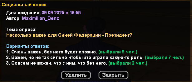 Как вы видите выше, практически одинаковое количество считает, что Президент очень важен, и что он не сильно важен, двое даже посчитали, что он совсем не важен. Наверное именно эти двое и рады, что президент до сих пор не выбран в нашей Федерации.
