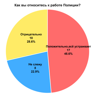 Таким образом,мы видим интересную картину,где менее 50% опрошенных жителей считает,что работа полиции действительно правильная,28,6% считают,что сотрудникам нужно многому учиться,поменять рабочую практику,пересмотреть отношение к работе,22,9% не следят за работой сотрудников.
