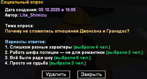 4) Предыстория либо же полезная информация: На прошлой неделе в Синей Федерации прошёл первый выпуск шоу «Давай поженимся». Главным героем стал шеф полиции ЛСПД Дмитрий Джонсон, который выбрал свою избранницу — Мию Гранадос. Однако спустя короткое время их история получила неожиданный поворот, вызвав бурное обсуждение среди жителей Федерации.