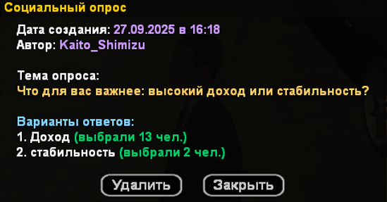 4) Предыстория либо же полезная информация: Опрос был проведён с целью выяснить, какие ценности играют большую роль для участников сообщества: стремление к высокому доходу или предпочтение стабильности. Такие результаты могут быть полезны при планировании игровых или реальных экономических моделей, а также при анализе мотивации людей в условиях выбора между быстрыми возможностями заработка и долгосрочной уверенностью в будущем.