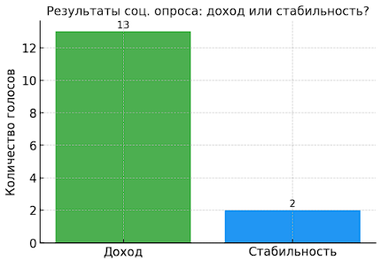 Результаты показали, что большинство участников ставят высокий доход выше стабильности. Это свидетельствует о стремлении к материальному росту и готовности жертвовать предсказуемостью ради больших возможностей.