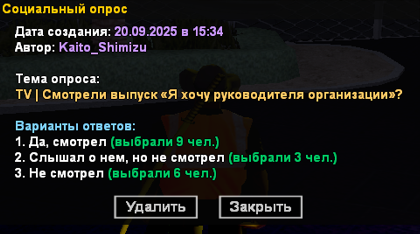 1) Кто куратор проведения социологического опроса (имя фамилия сотрудника, который создаёт и выкладывает соц. опрос): Kaito Shimizu