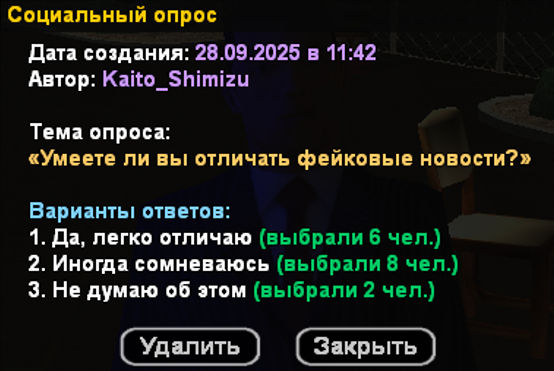 2) Сотрудники, занявшиеся проведением социологического опроса (имена и фамилии сотрудников, которые проводили соц. опрос): Kaito Shimizu, Alex Soul
